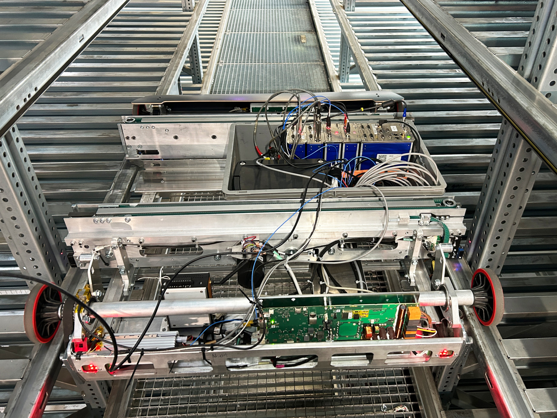 Bei TGW Logistics in Wels führten wir Vibrationsmessungen am Fahrantrieb eines Shuttles unter realen Betriebsbedingungen durch – direkt auf der Prüfstrecke, u. a. mit IMC CRFX 2000G, triaxialen Beschleunigungssensoren und Dehnmessstreifen.